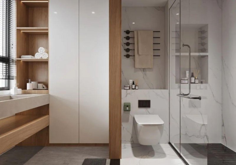Top-to-top design increases the storage space in the bathroom. Moreover, the embedded high cabinet has a ceiling, which forms a whole with the wall surface, and the visual effect is more refreshing, which greatly improves the space utilization rate, and at the same time, it can lengthen the space ratio and make the bathroom look more atmospheric!