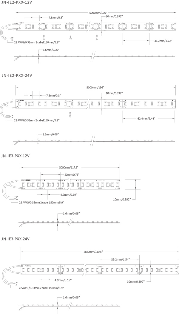 -光效高达140LM/W;-不同订单的颜色高度一致;-剪4颗LED为12V DC,剪8颗LED为24V DC;-3M VHB 胶带,便于安装;-IE-PX 和IE2-PX为标准5米每卷,JN-IE3-PX为3米每卷-5.8W/M、11.5W/M和17.2W,不同功率可选。